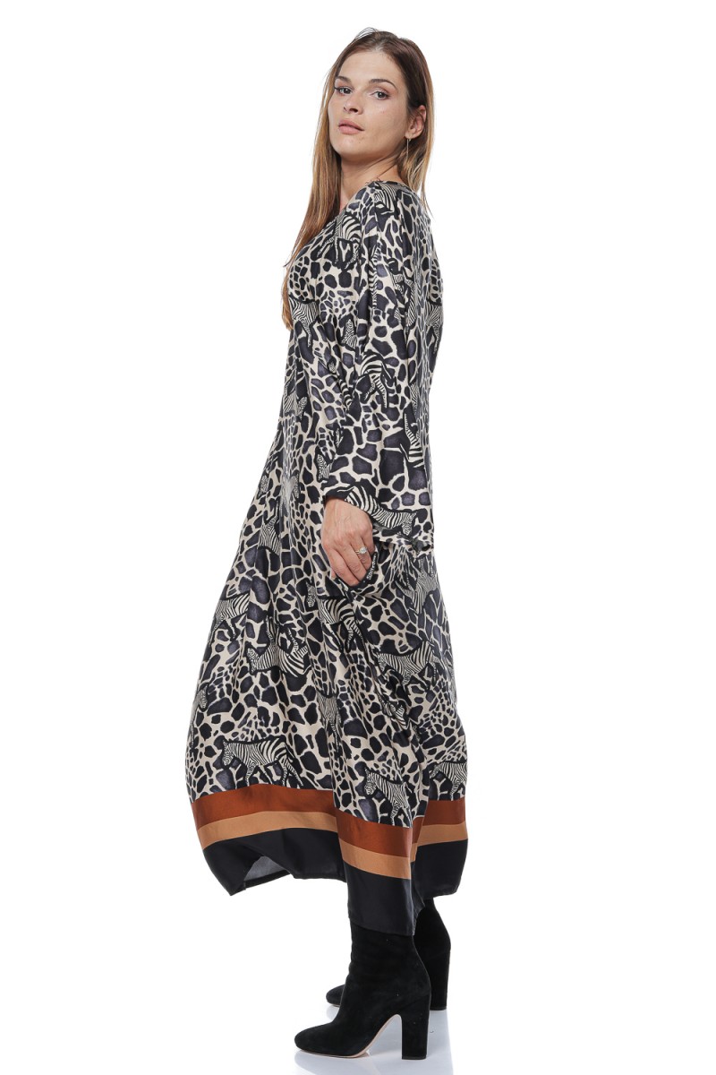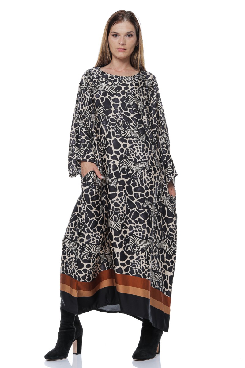 Rochie lunga, dreapta, din satin cu maneca lunga si buzunare laterale. Croiul lejer poate imbraca mai multe tipuri de silueta. Decolteul este la baza gatului, materialul este moale si placut la atingere. Maneca este cazuta.