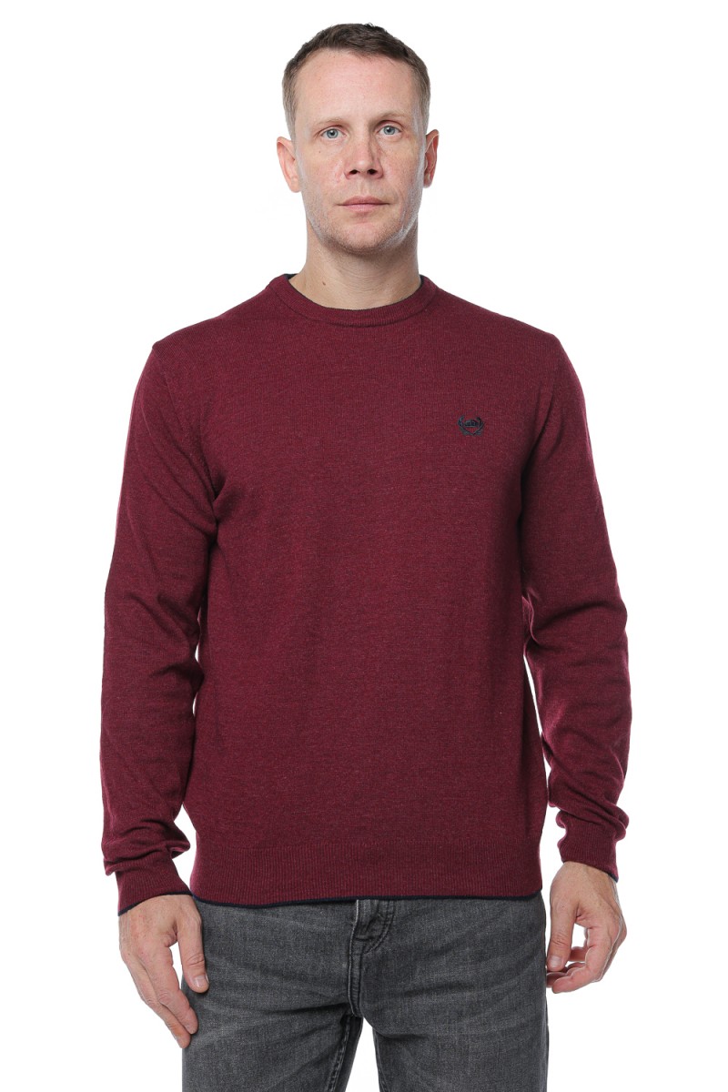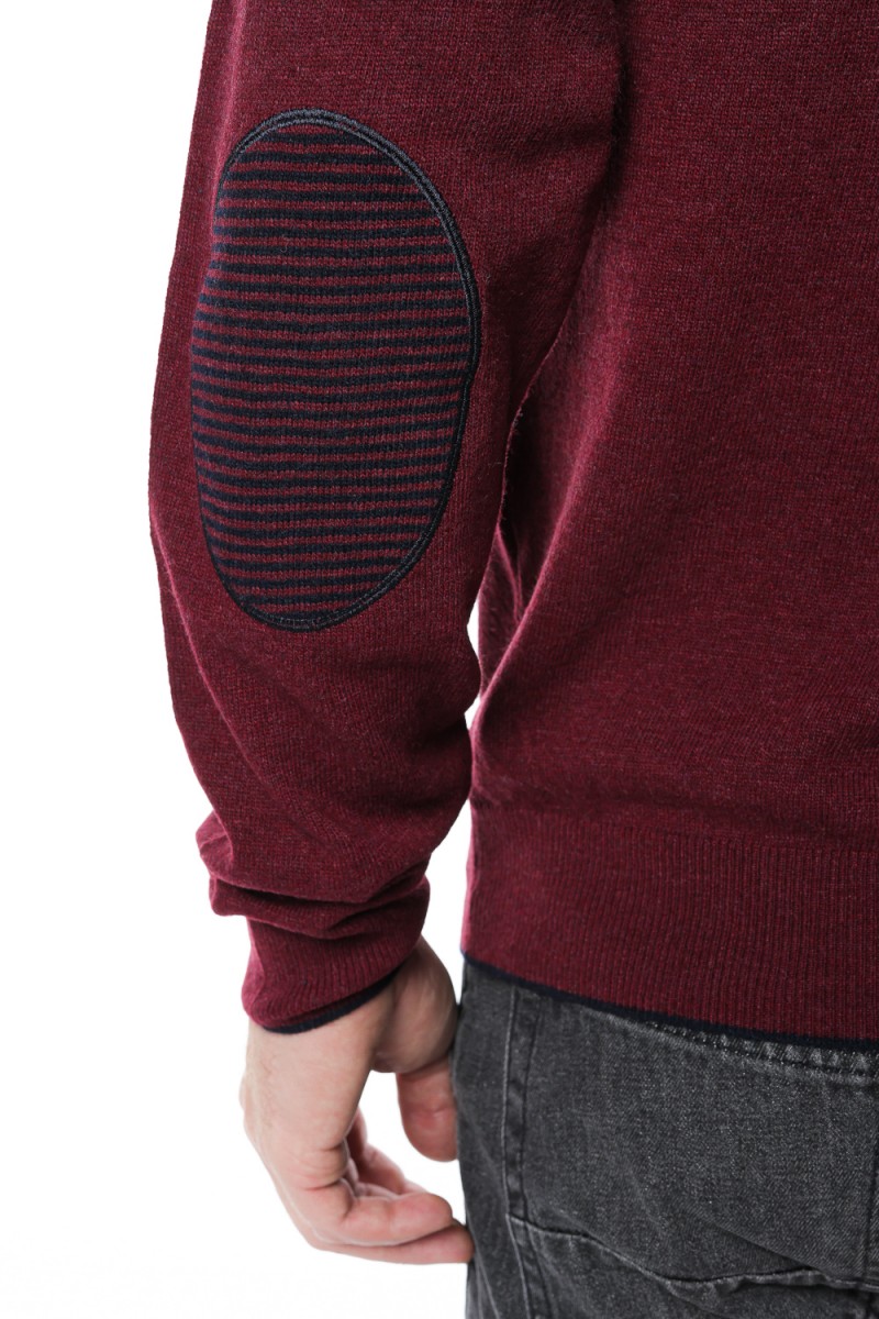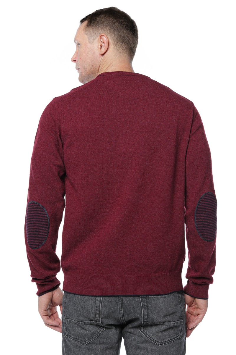 Pulover din lana cu decolteu la baza gatului, mansete striate si coate peticite. Materialul este subtire, dar calduros.