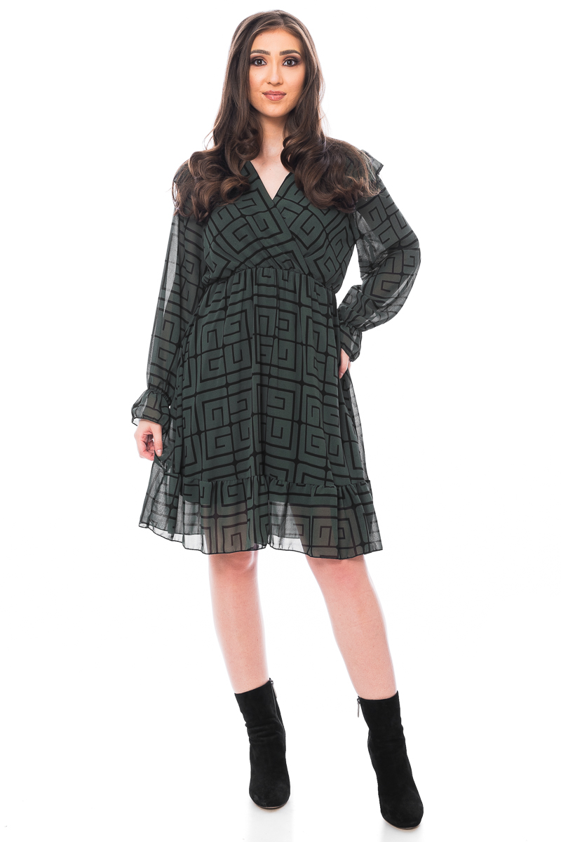 Rochie deosebita, cu decolteu petrecut si fusta plisata si usor evazata. Este confectionata dintr-un voal putin mai gros si este dublata, mai putin in zona manecilor. Talia este stransa pe elastic, manecile sunt lungi, stranse la incheietura si cu un volan aplicat in zona umerilor.