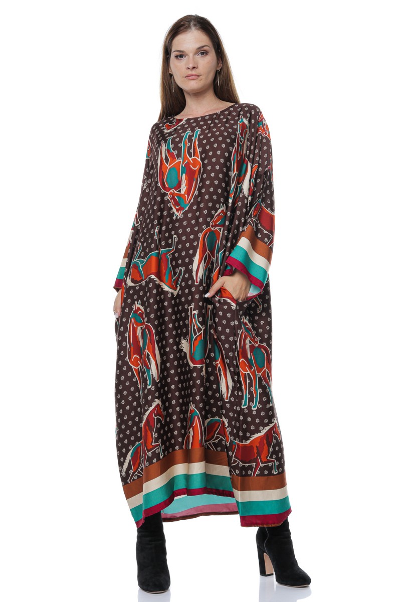 Rochie lunga, dreapta, din satin cu maneca lunga si buzunare laterale. Croiul lejer poate imbraca mai multe tipuri de silueta. Decolteul este la baza gatului, materialul este moale si placut la atingere. Maneca este cazuta.