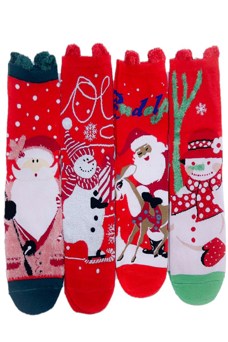 Set de 4 sosete parfumate cu motive de Craciun, frumos ambalate intr-o cutie asortata, gata de asezat sub brad! Sosetele sunt lungi, fara cusatura, iar figurinele de pe ele sunt partial iesite in relief. In cutie, sub soset, gasiti si un bradut parfumat. Cutia este legata cu o panglica aurie.