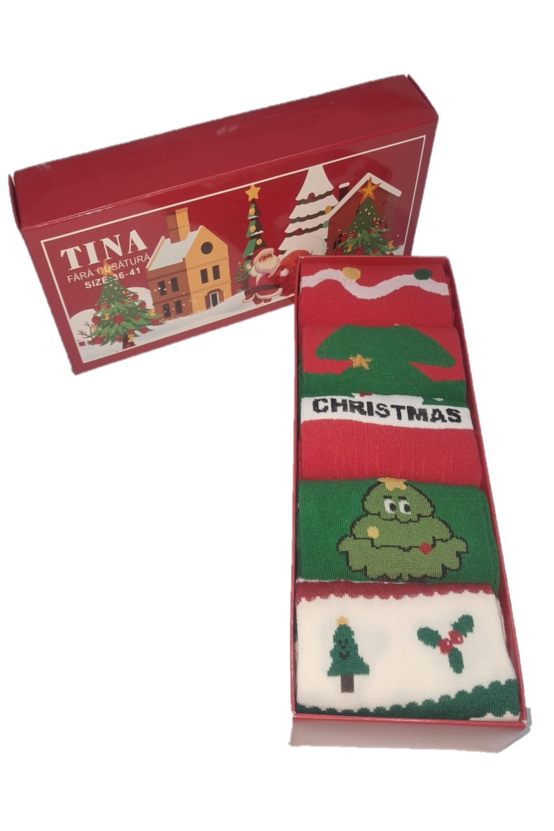 Un cadou perfect pentru Craciun: set de 5 sosete fara cusatura ambalate frumos intr-o cutie rosie. Setul contine 5 sosete diferite.
