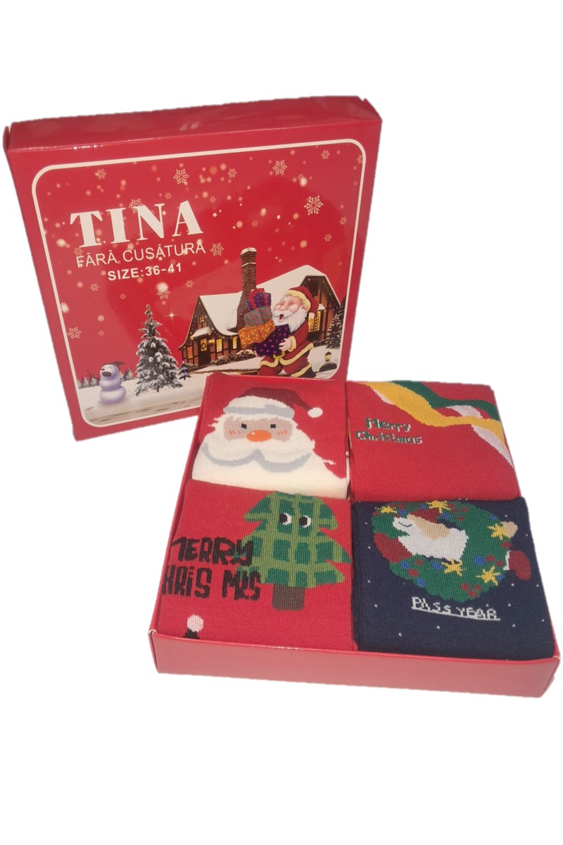 Un cadou perfect pentru Craciun: set de 4 sosete fara cusatura ambalate frumos intr-o cutie rosie. Setul contine 4 sosete diferite.