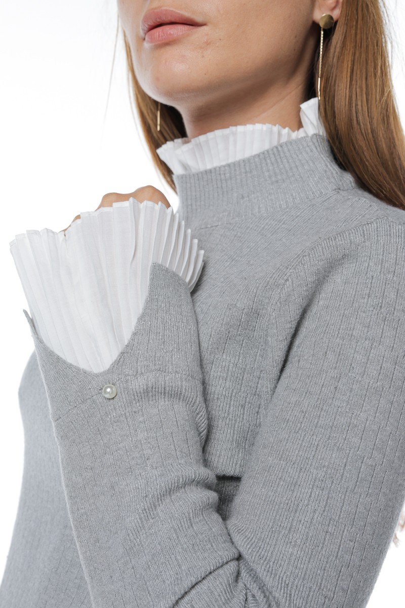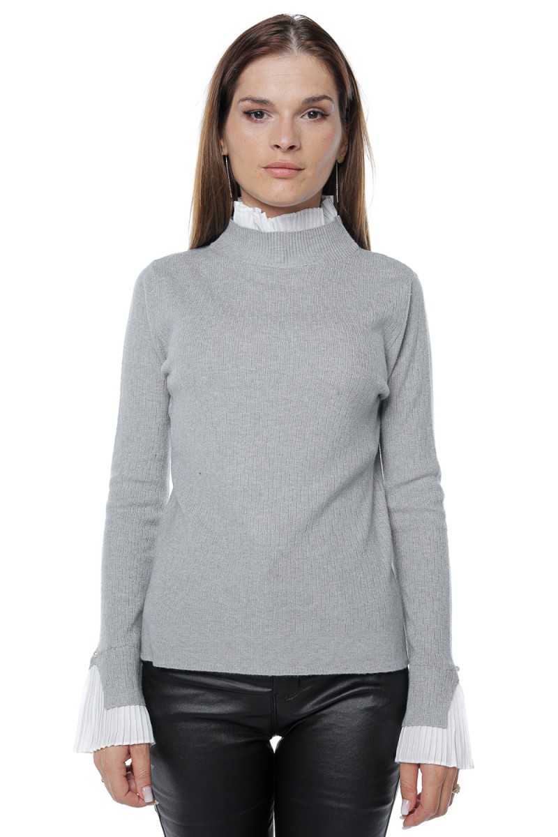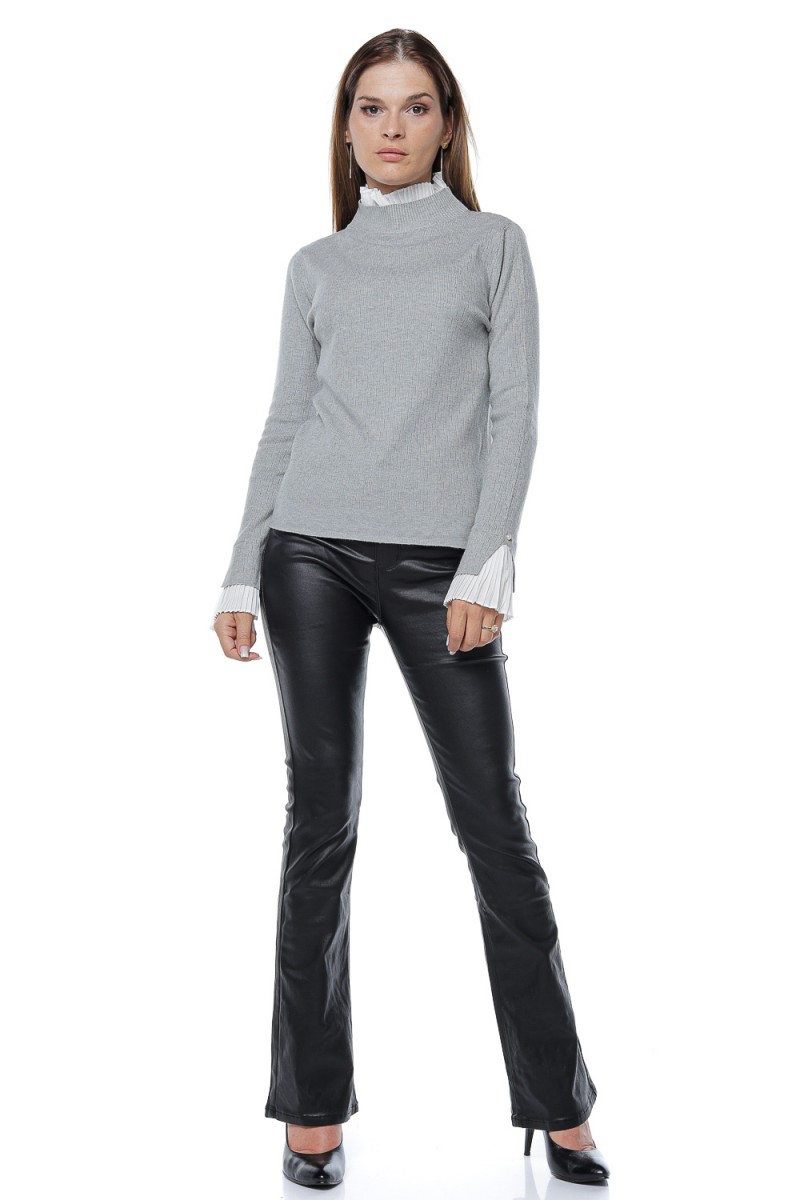 Helanca cu mansete si guler de camasa. Materialul este cu striatii, moale si placut la atingere. manecile sunt lungi, despicate in partea de jos si accesorizate cu o perluta.