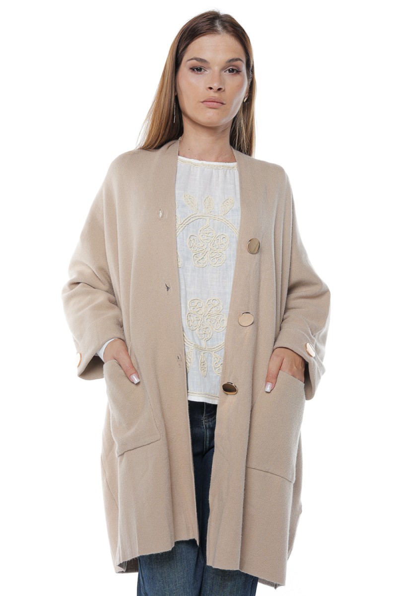 Jacheta oversize cu maneci cazute, tip fluture si buzunare aplicate pe partea din fata. Inchiderea se face cu trei nasturi aurii, aceeasi nasturi gasindu-se si pe mansete.