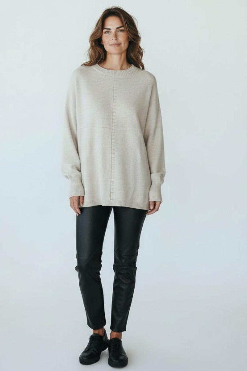 Pulover deosebit de moale si placut la atingere, cu mansete si terminatii striate. Pe partea din fata are un model cu dungi si un lantisor argintiu inserat. In laterale este usor desfacut (7cm).