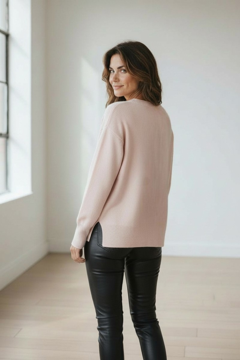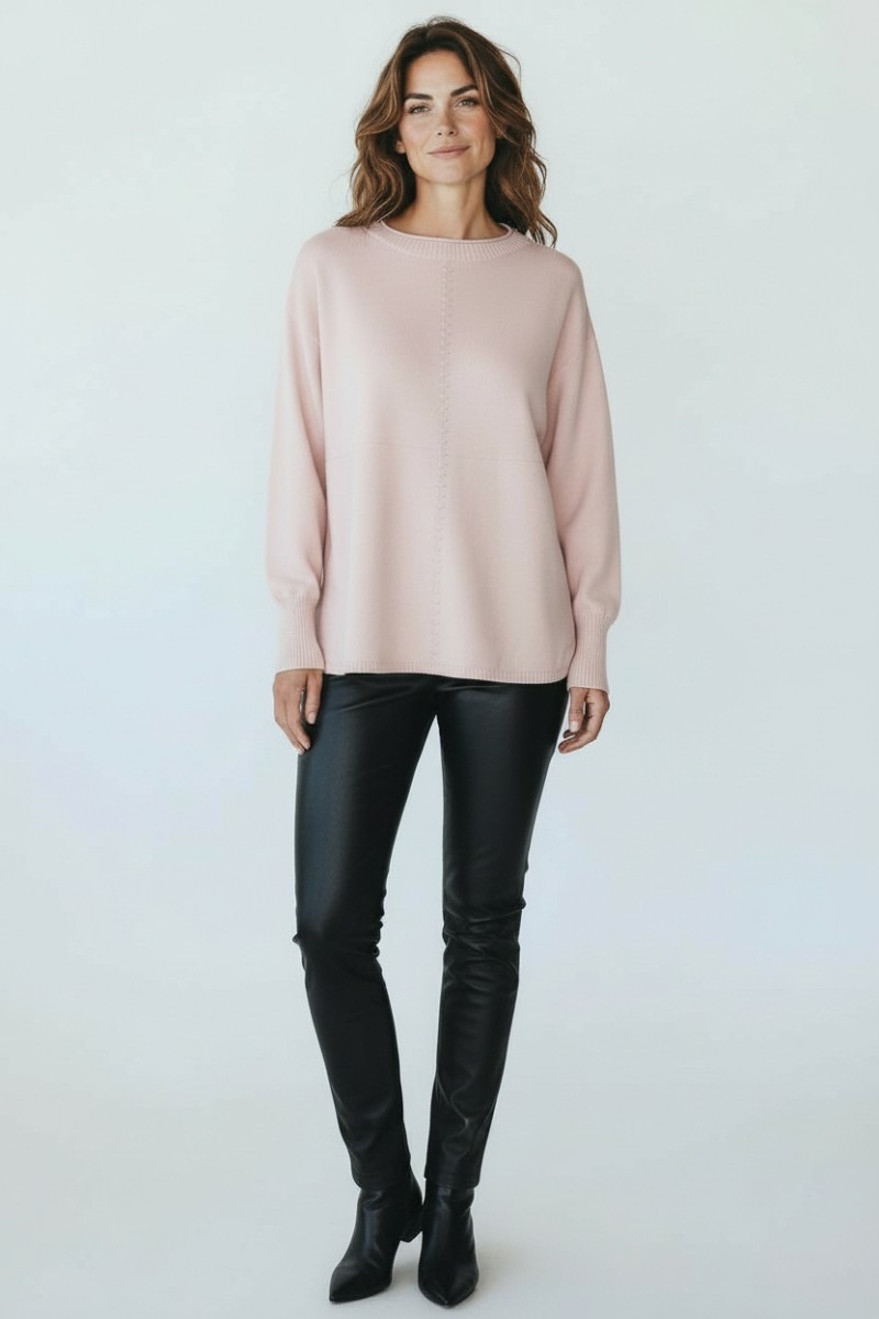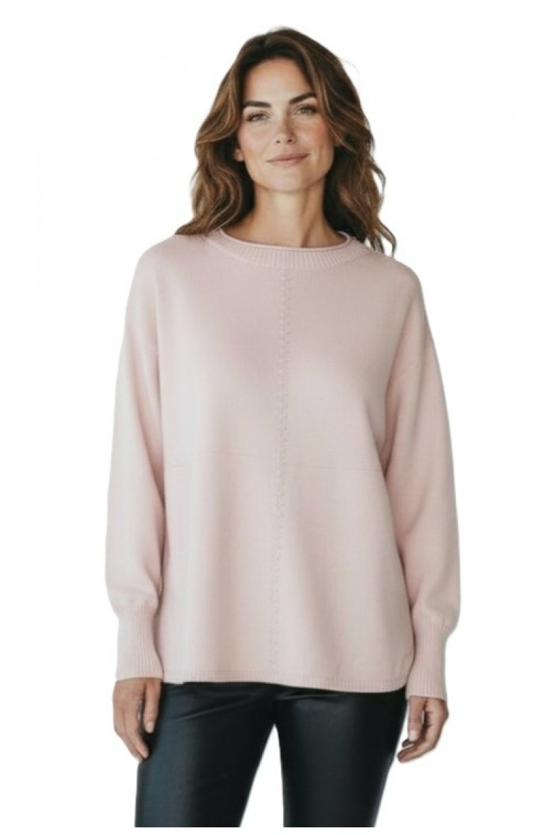Pulover deosebit de moale si placut la atingere, cu mansete si terminatii striate. Pe partea din fata are un model cu dungi si un lantisor argintiu inserat. In laterale este usor desfacut (7cm).